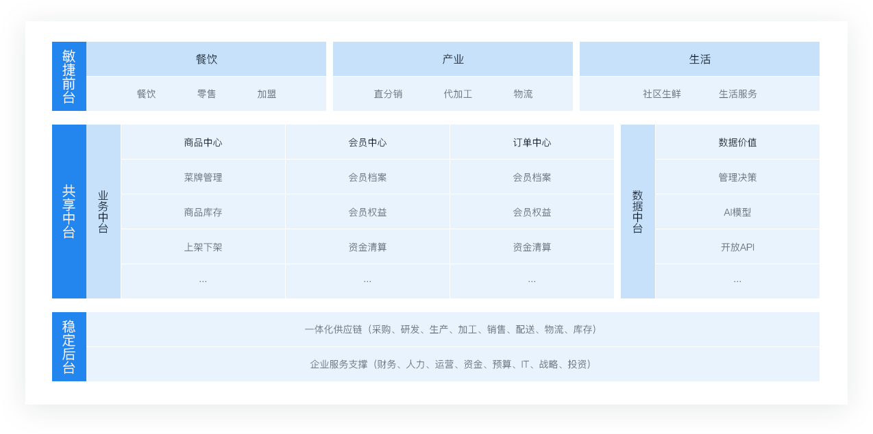 敏捷前台为员工、客户、伙伴提供场景化、移动化的协同工作平台;智能中台构建以数据为驱动的业务过程管控与共享服务,实现基于数据的智能决策; 稳定后台为企业数字化转型提供稳定、灵活、安全的平台支撑。